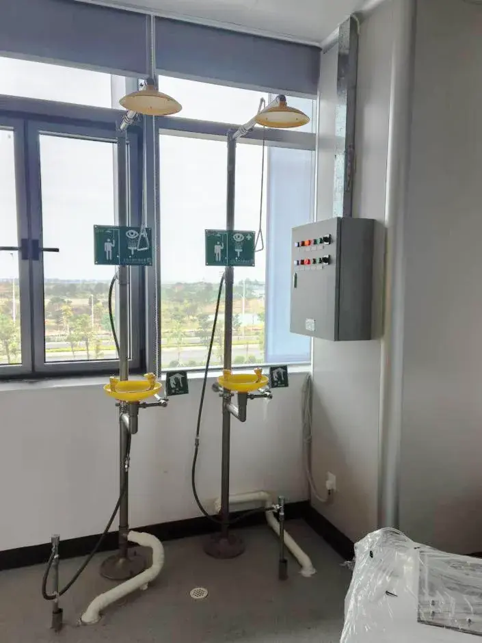 应急喷淋洗眼器与插座距离太近,设备出水可能溅到插座上,或引发触电