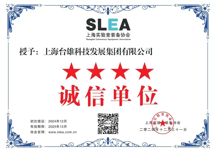 经过层层筛选与考核,台雄集团获得了一项极具分量的荣誉 —— 上海市实验室装备协会四星级诚信单位称号!这不仅是对台雄集团过往工作的高度认可,更是激励我们不断前行的动力。